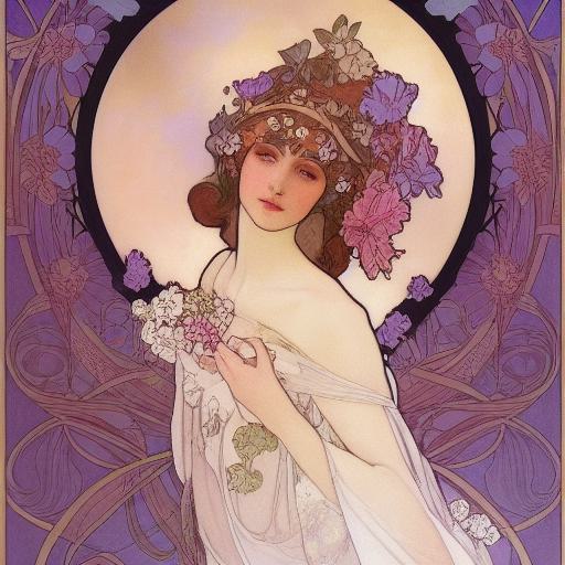 Let’s take a look at our prompt, “a painting of a woman with flowers in her hair, an art nouveau painting, alsphonse mucha, elegant, artistic, flowers around the woman“.