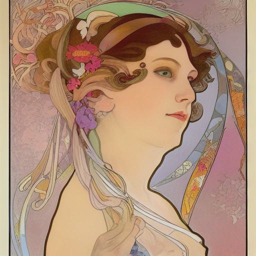 Style of Alphonse Mucha: By invoking the style of Alphonse Mucha, the prompt prompts the AI to incorporate his signature techniques and artistic choices into the artwork. This can include the use of decorative borders, ornamental details, and a stylized portrayal of the female figure.