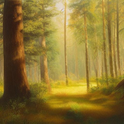 A painting of many trees and grass in a forest