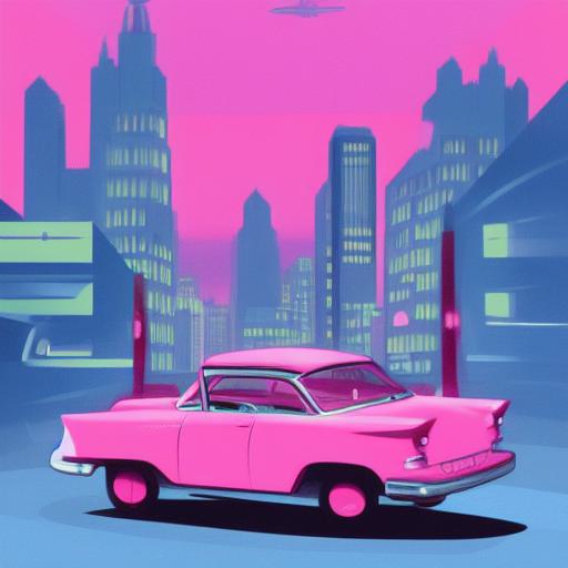 A pink car driving down a street at night