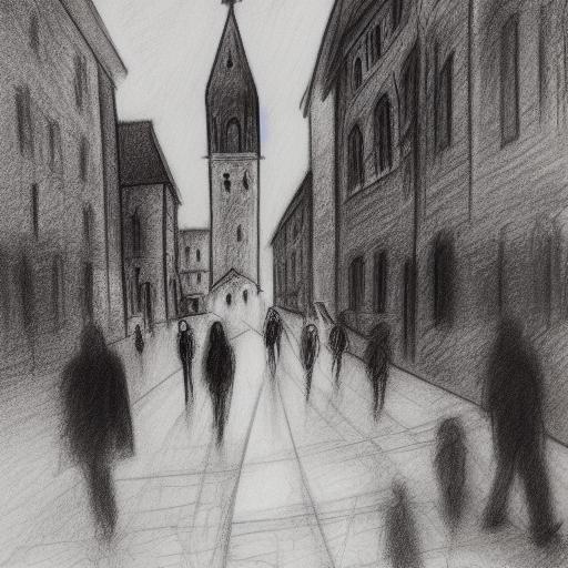 A rough black and white drawing of a city and church a day with many people on street