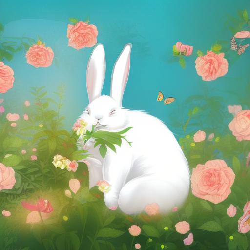 A white rabbit sleeping in the middle of a forest with roses and butterfly