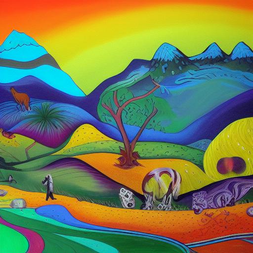 The phrase “psychedelic art” is repeated twice in the prompt, indicating that this is a key element that the image should incorporate. This style of art is known for its bright, vivid colors and intricate patterns, which can be seen in the psychedelic landscape and ski resort mentioned in the prompt.