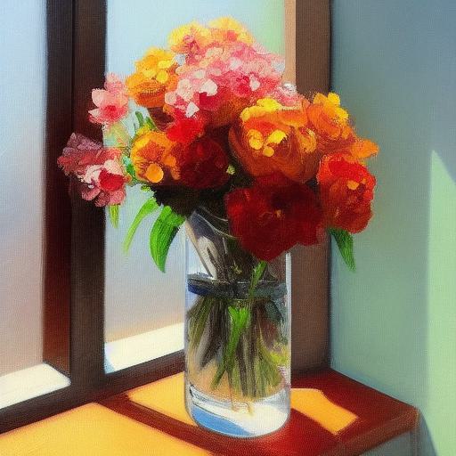 The painting of some flowers in a vase on a window sill