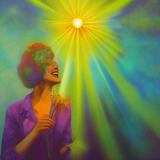 5. Lighting: The lighting in the prompt is described as having crepuscular rays, which adds to the psychedelic effect. This will influence the AI to create an image with similar lighting, possibly with rays of light shining down on the woman and the flower she is holding.