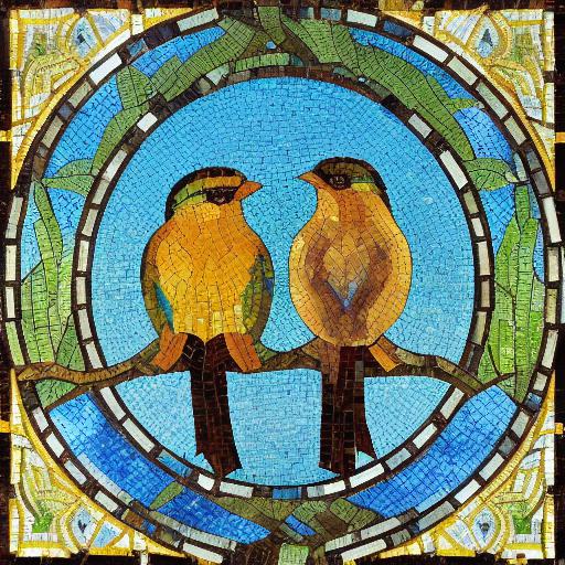 All of these individual parts of the prompt come together to influence the resulting AI-generated image. The birds and tree branch provide the main focal point of the image, while the art nouveau style and glass mosaic technique influence the overall composition and texture of the piece. The blue and yellow color palette adds a natural, organic feel to the artwork, while also emphasizing the birds and their surroundings.