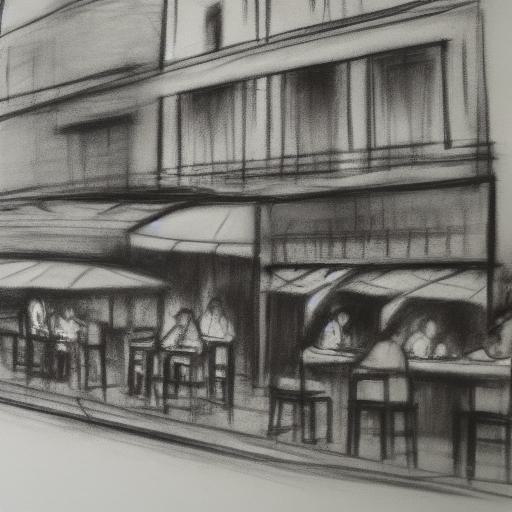 A black and white Charcoal drawing of a city street with a restaurant and bar and people eating outside