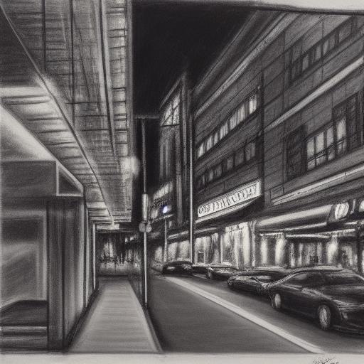 A black and white Charcoal drawing of a city street with a restaurant and bar at night time