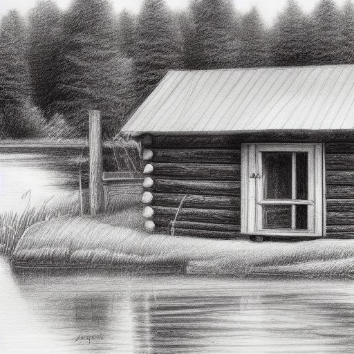 A black and white drawing of a cabin near a lake