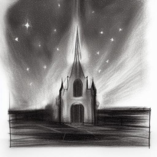 A black and white drawing of a city and church at night with a soothing starry sky a charcoal drawing by László Paál