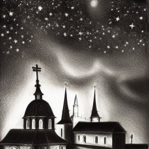 A black and white drawing of a city and church at night with a starry sky