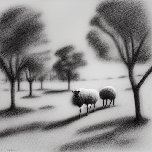 A black and white drawing of sheep and trees in the landscape
