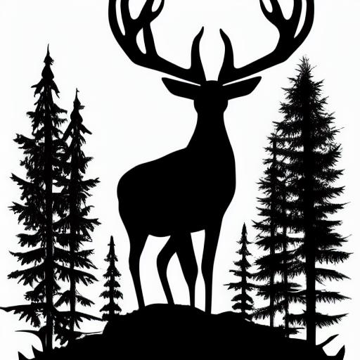 A black and white silhouette of a deer in a forest with sky
