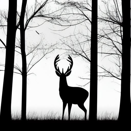 A black and white silhouette of a deer near river and trees