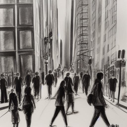 A charcoal painting of people walking down a street