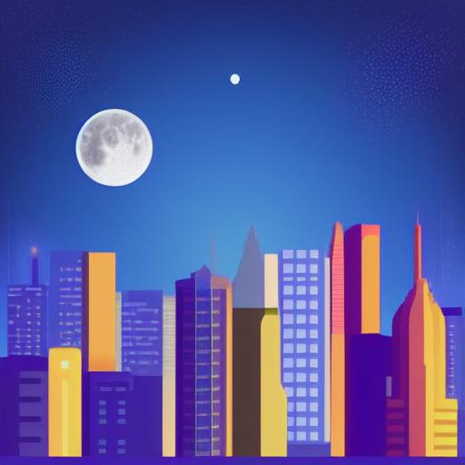 A city at night with a moon in the sky