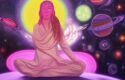 A close-up painting of a woman sitting on a psychedelic rock in space