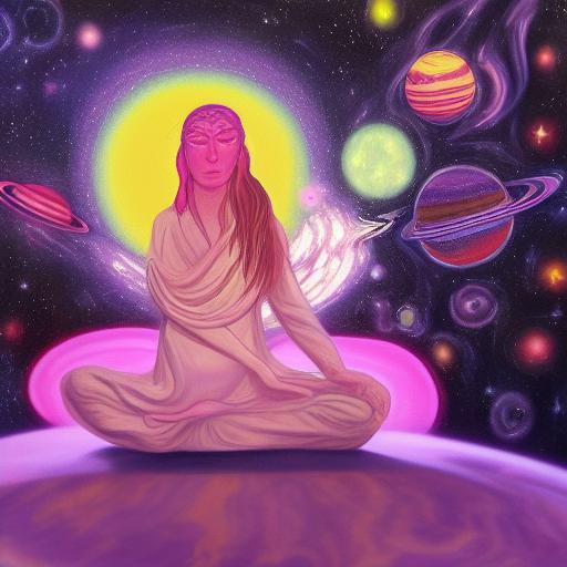About A close-up painting of a woman sitting on a psychedelic rock in space