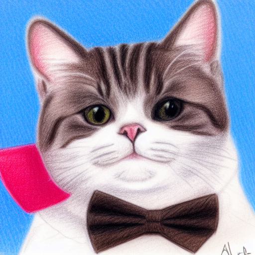 A crayon drawing of a close up cat wearing a tiny bow tie