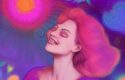 About A digital 2D fantasy psychedelic artwork painting of a woman holding a laughing flower