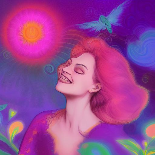 About A digital 2D fantasy psychedelic artwork painting of a woman holding a laughing flower