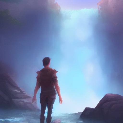 A digital painting of man standing in front of waterfall