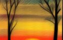 A drawing of a sunset with a tree