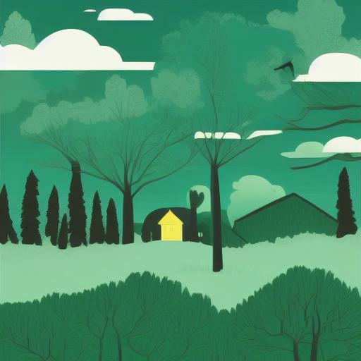 A green and black landscape with trees and houses