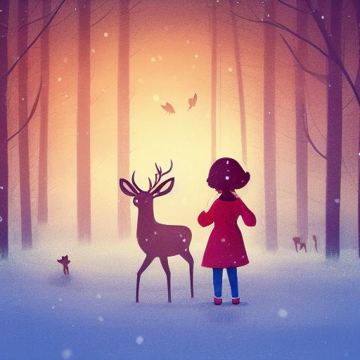 A happy little girl with red hood facing backward standing next to a deer in the snow at evening