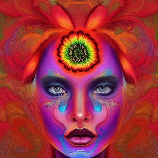 - Description: A highly detailed close-up painting of a psychedelic woman’s face, with a red flower in her hair.