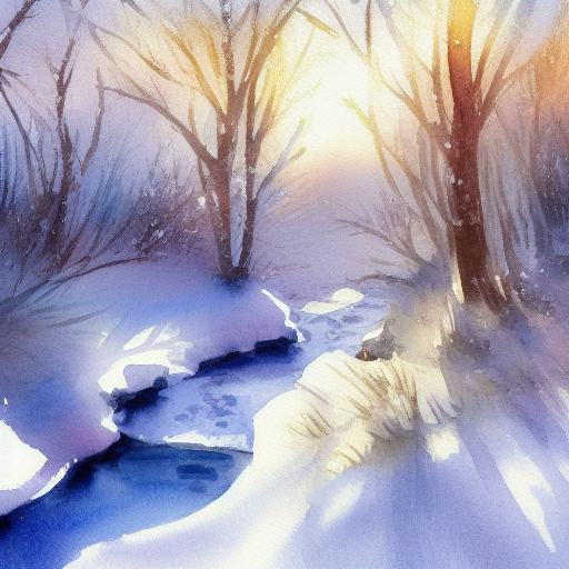 About A light watercolor painting of snow-covered trees and a stream with sunshine