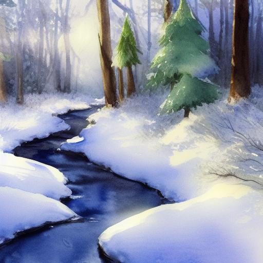 A light watercolor painting of snow-covered trees and a stream with sunshine