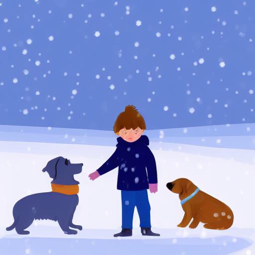 A little boy standing next to a dog in the snow