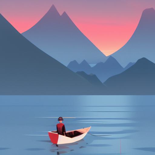 A man in a boat on a lake with mountains in the background