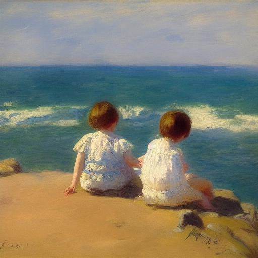 A melancholic painting of two children sitting on a rock by the ocean