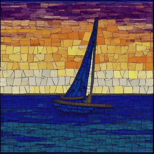 A mosaic of a sailboat on a body of water