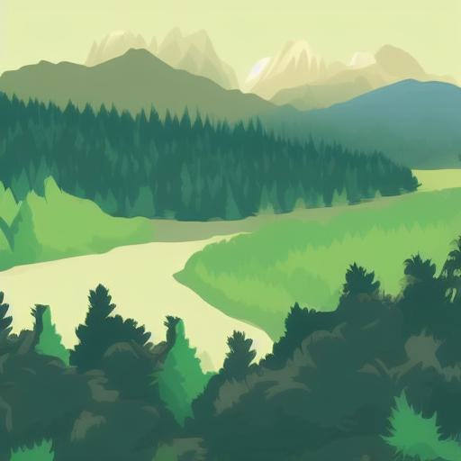 A mountain landscape with pine trees and lake