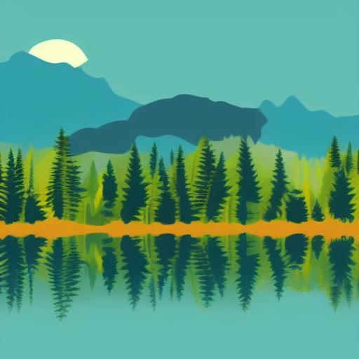 A mountain landscape with several pine trees and lake in the foreground