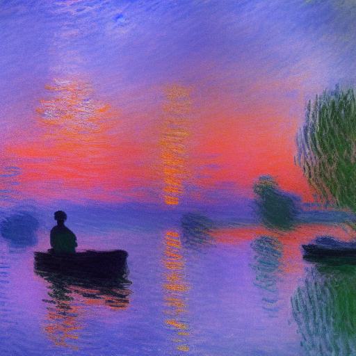 A painting of a boat in a body of water at neon sunset