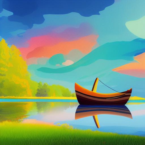 A painting of a boat in the middle of a lake