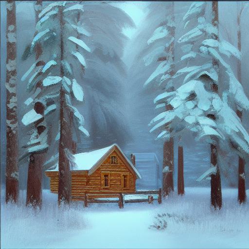 A painting of a cabin in a snowy forest