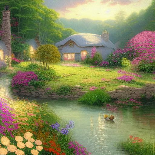 A painting of a cottage and a river
