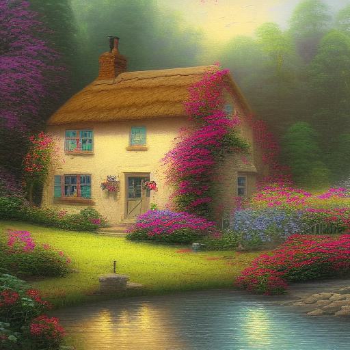 A painting of a cottage by a river with beautiful flowers