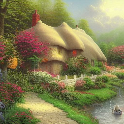 A painting of a cottage by a river with greenery