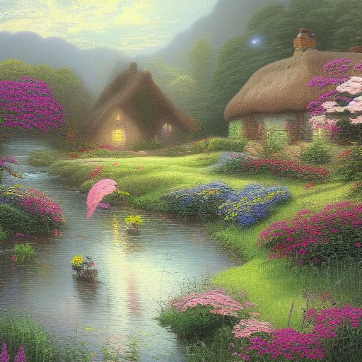 A painting of a cottage with a river and flowers
