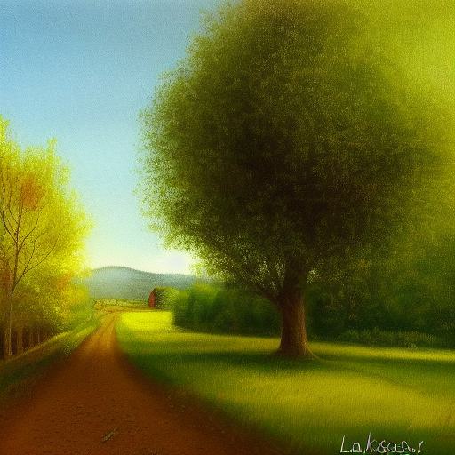 A painting of a country road with an apple tree