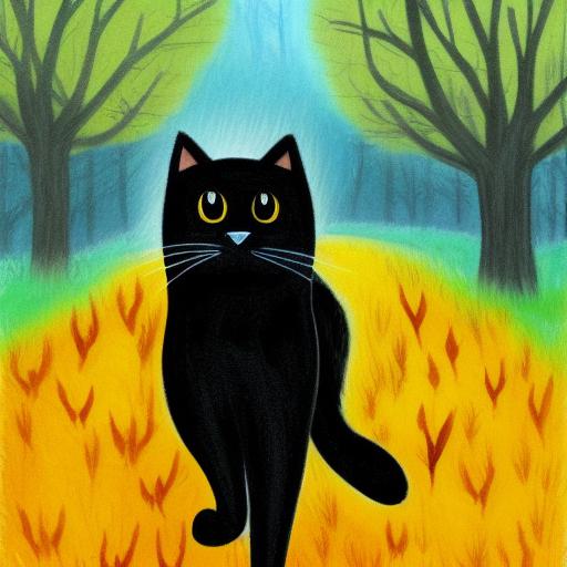 A painting of a giant black cat running in the autumn forest in rainy day