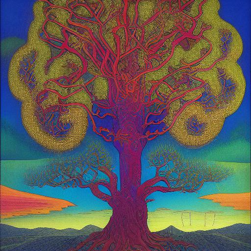 A painting of a giant tree and sky in the background