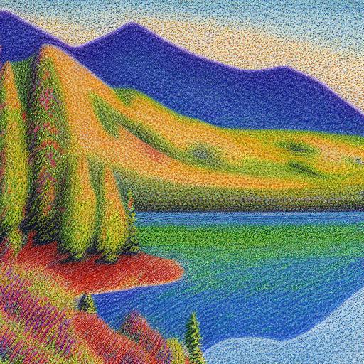 A painting of a lake with mountain