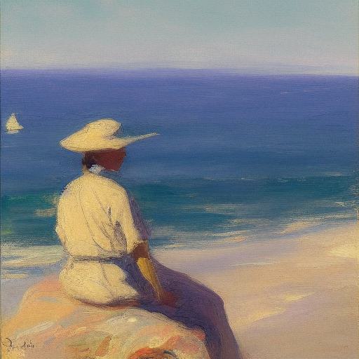 A painting of a person sitting on a rock by the ocean